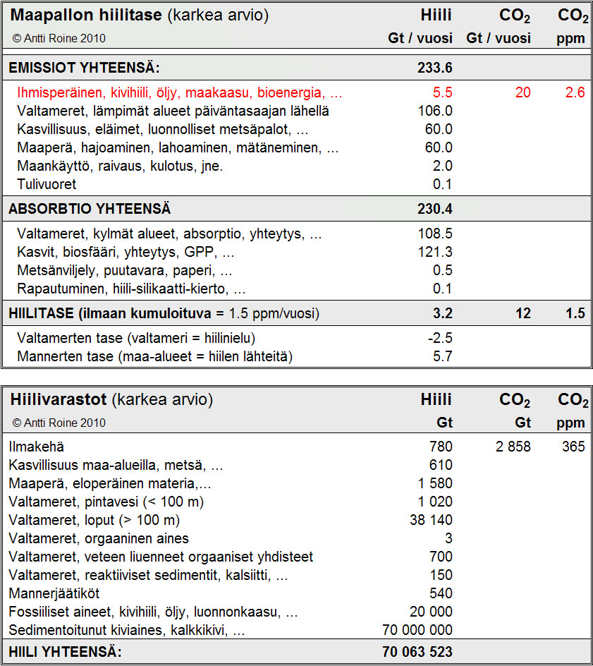 - Maapallon hiilitase ja varastot. Ihmisperäisten hiiliemissioiden määrä on vain 2.4 % luonnon omien hiiliemissioiden määrästä. Ilmakehän hiilidioksidipitoisuus kasvaa joka vuosi noin 1.5 ppm-yksikköä, koska valtamerten pintaveden lämmetessä mereen absorboituva määrä vähenee.