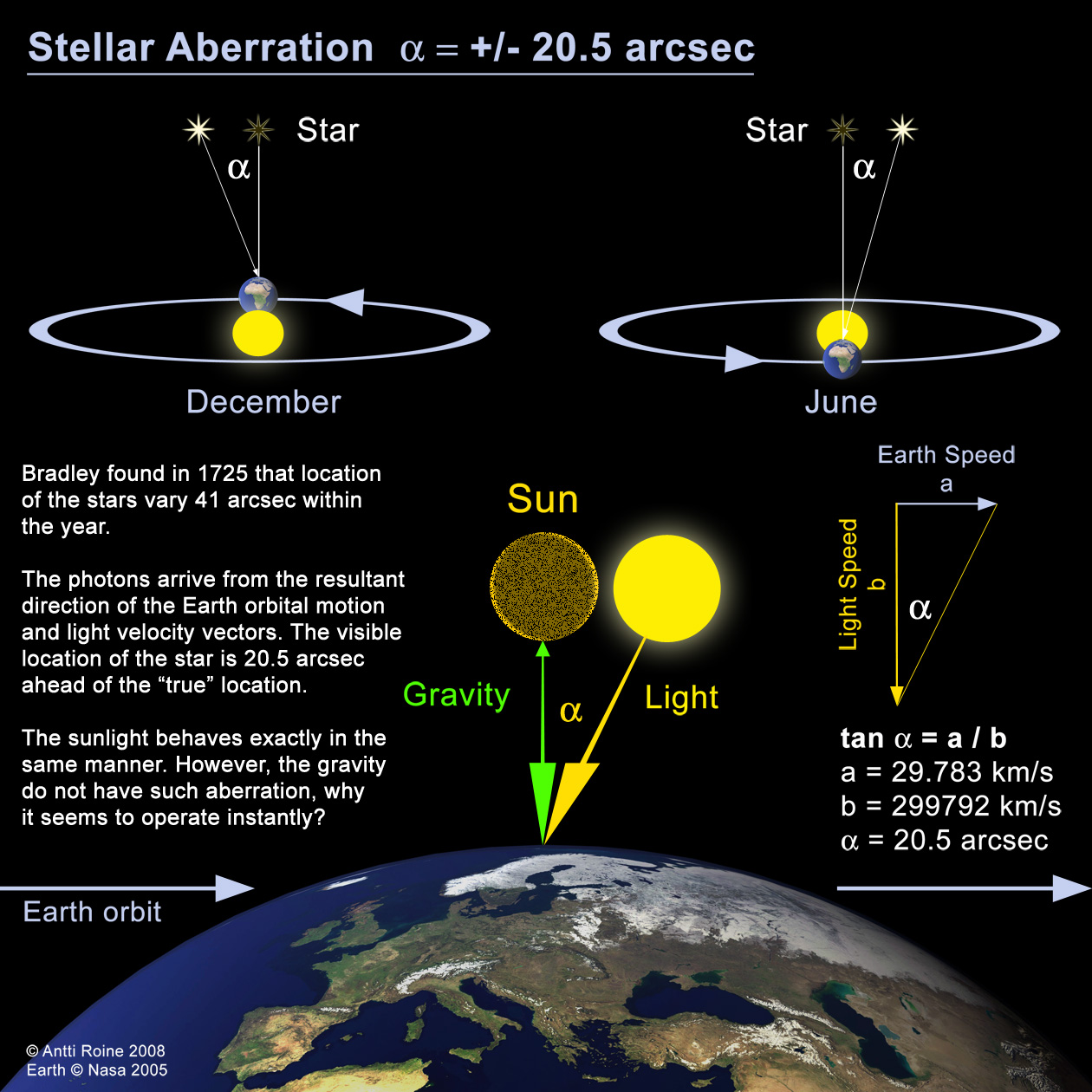 Stellar aberration was discovered already in 1725 by James Bradley, who found location of the stars to vary some 41 arcsec within the year. The finite speed of light and Earth orbital motion around the Sun was found to create this aberration. The star light seems to arrive from the direction slightly ahead of the true location of the star. This direction may be calculated as a resultant of the light speed and Earth orbital velocity vectors. The aberration angle Alpha may be calculated from these vectors using formulas: