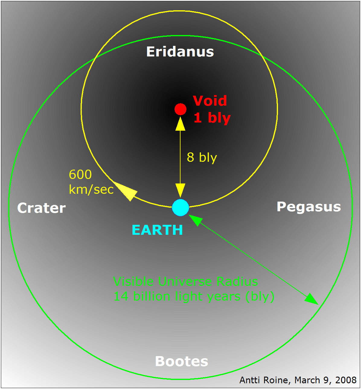 According to COBE measurements our Earth is moving towards Leo constellation using speed of 400 km per second. The Milky Way is moving towards Crater, the speed is 600 km per second (some older sources talk about Centaurus - Hydra). It is quite a coincidence that the angle between Earth cruising path and Giant Void in Eridanus is 90 degrees! In this mean the Giant Void in Eridanus may be the center of our universe. If this idea can be verified then we do not need the fictional Great Attractor at Crater or Centaurus direction. Ofcourse this is still only a logical guess, but most of the scientific facts have been found by testing logical guesses. Lot of experimental research is, however, needed before we can say that the center of the universe have been found. (This chapter was added at 19 February, 2008).